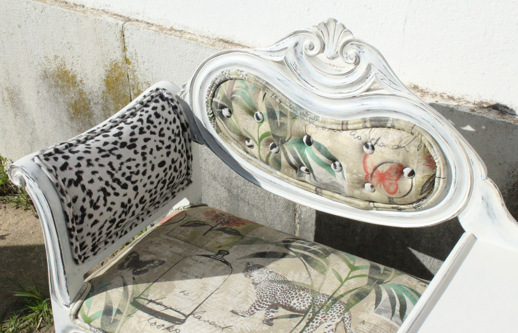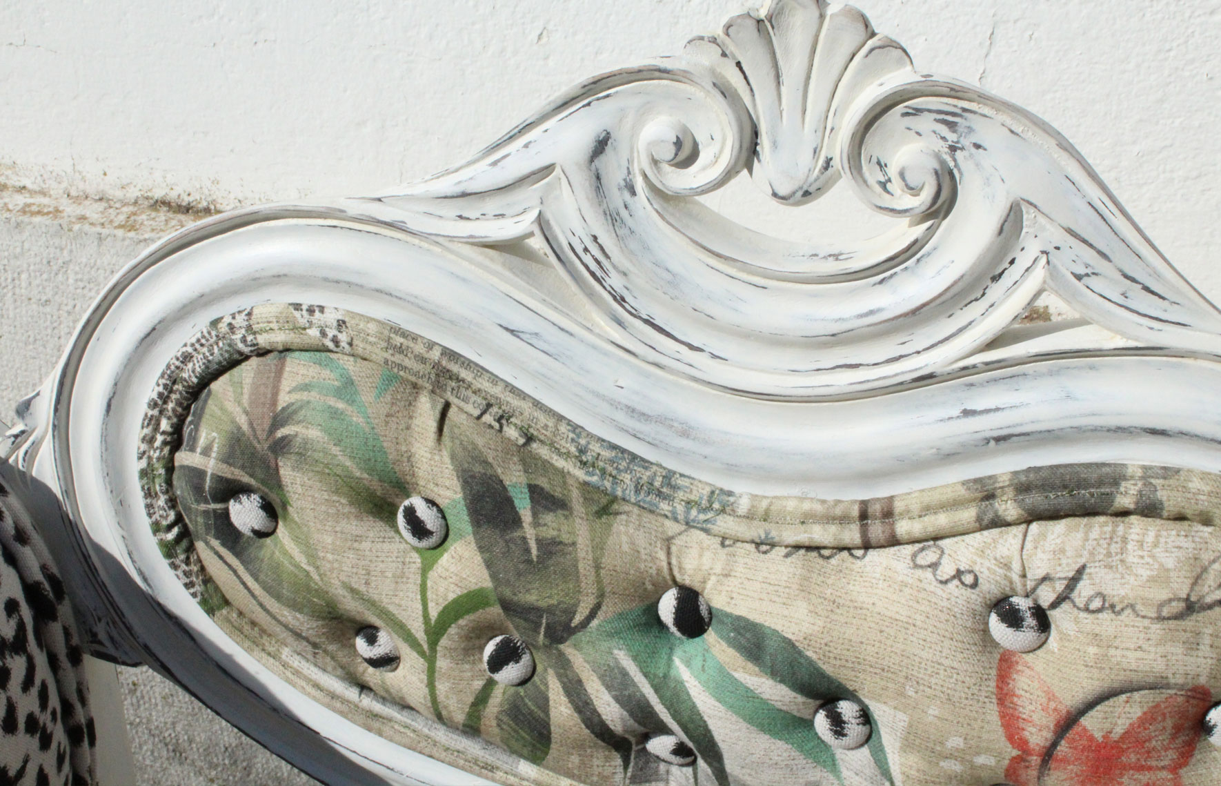 Dois tecidos diferentes mas que se completam. Botonê no encosto, técnica muito explorada nas décadas de 50 e 60.